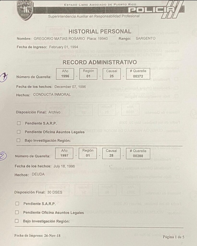 Let’s start with the basics: Gregorio Matías Rosario joined the Puerto Rico Police in 1994 as a sergeant (placa 19940). Fast-forward to today, and he’s the Majority Leader in the Senate of Puerto Rico, elected at-large and cozying up in power since around 2020. But before he traded his uniform for a suit, Matías racked up 11 administrative complaints between 1996 and 2012, according to his own “Historial Personal” record, printed November 26, 2018. These aren’t parking tickets—these are serious accusations of misconduct that paint a picture of a reckless, immoral thug who abused his authority time and again. And get this: Many ended up “archived” or with slap-on-the-wrist penalties like days without pay (DSES). No real accountability, just the system protecting its own.